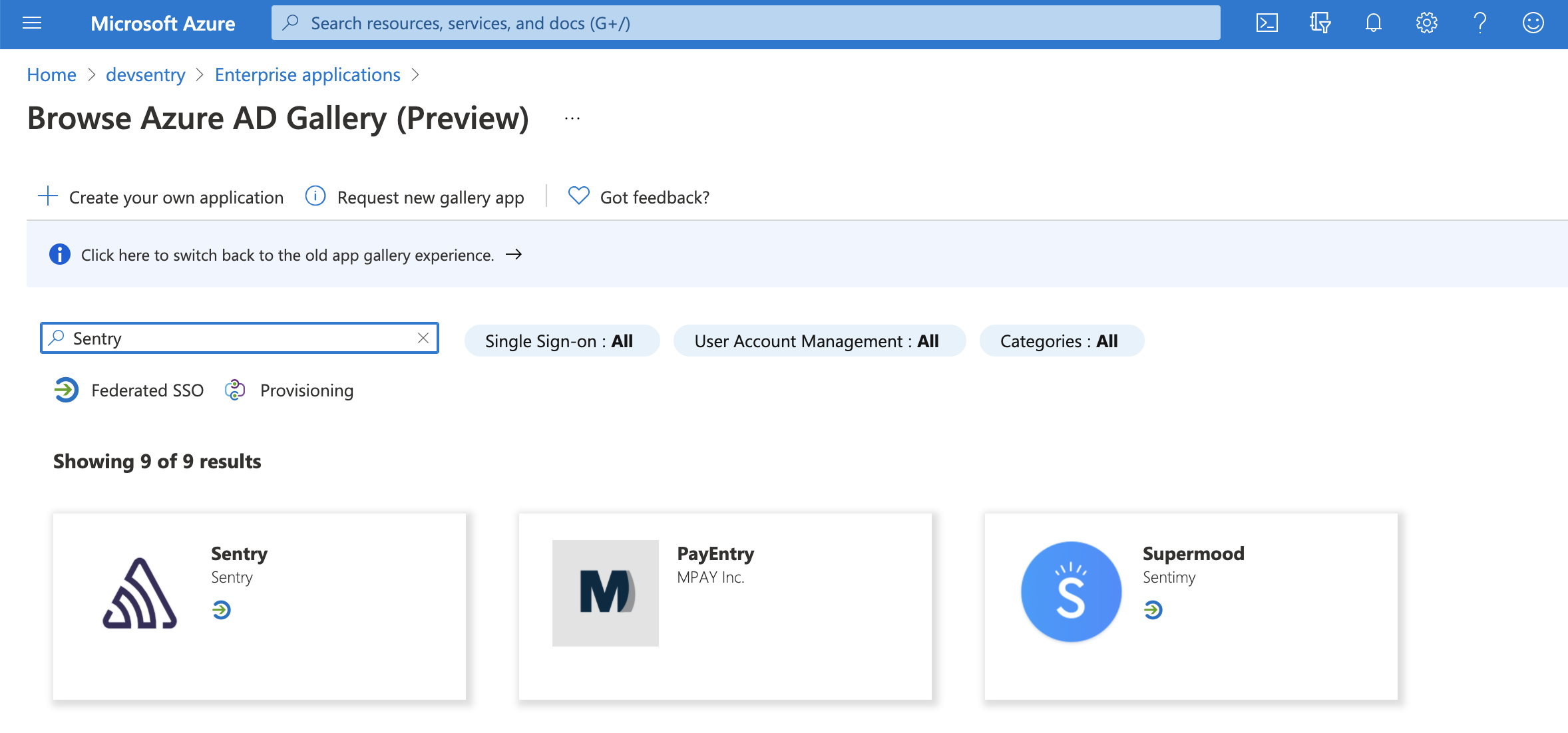 Sentry users can manage provisioning using Azure with SCIM. You'll need to have Azure SSO set up and configured for your organization already. Sentry supports User and Group provisioning with Azure.