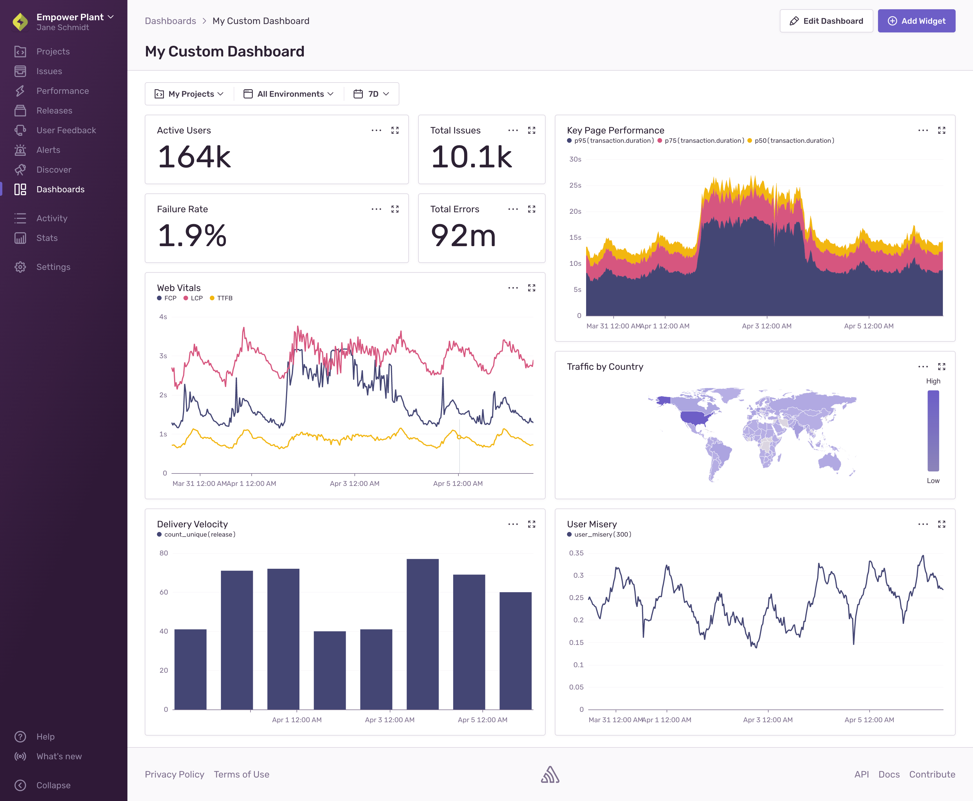 Sentry's Dashboards provide a single view of your application's health, including the ability to navigate issues and performance across multiple projects.