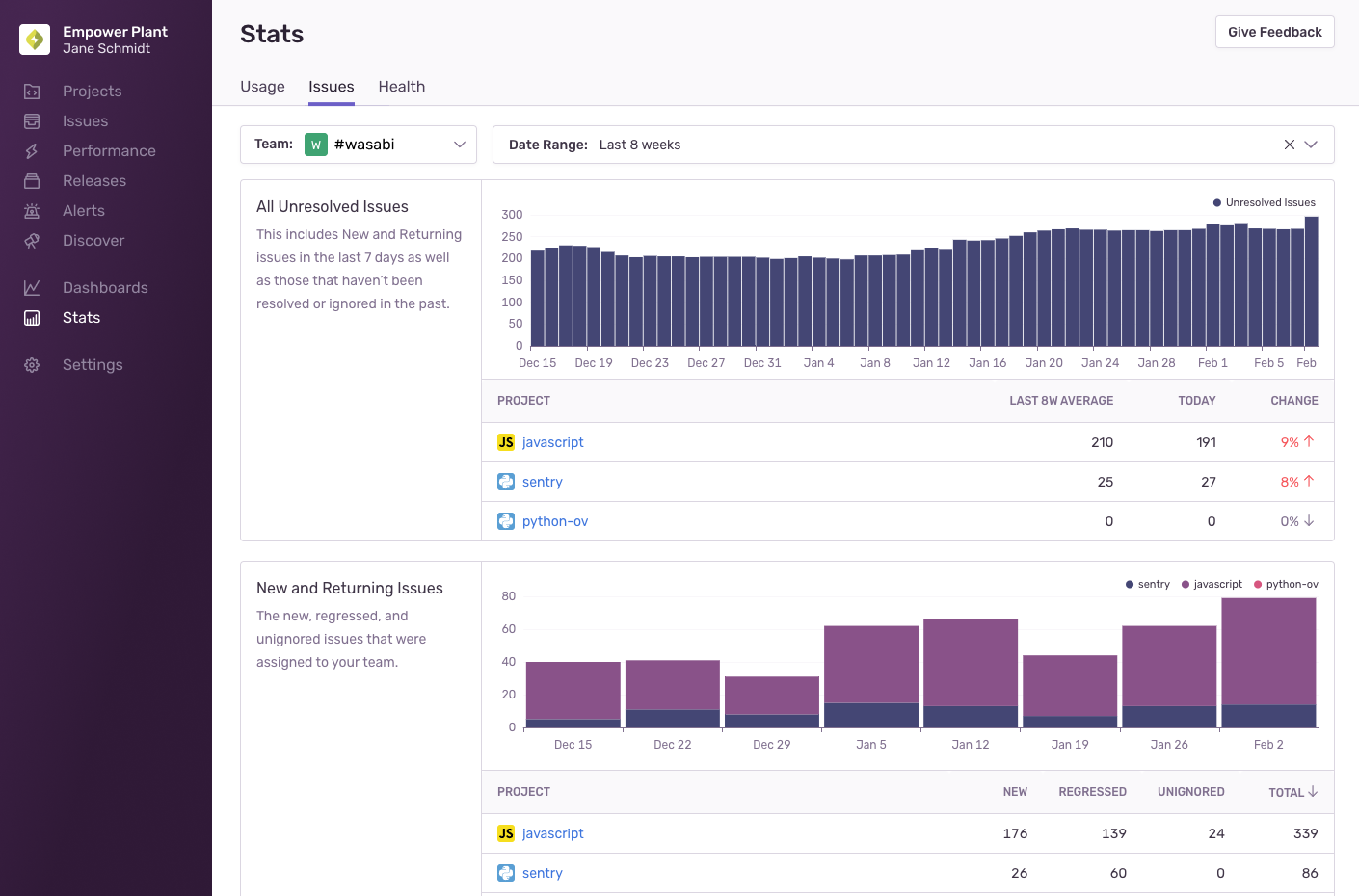 Get an overview of how your organization and each project is using Sentry.