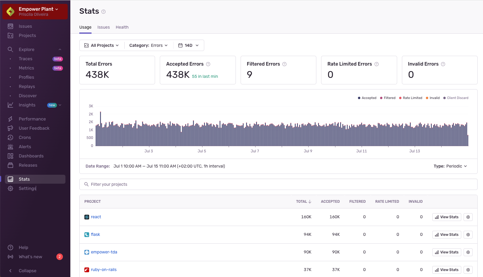 The Stats page is an overview of the usage data that Sentry receives across your entire organization. It allows you to spot projects that have experienced recent spikes in activity or are showing more errors than others and may require a closer look. You can also adjust the displayed date range, enabling you to narrow down to a specific time period or zoom out for a broader view.